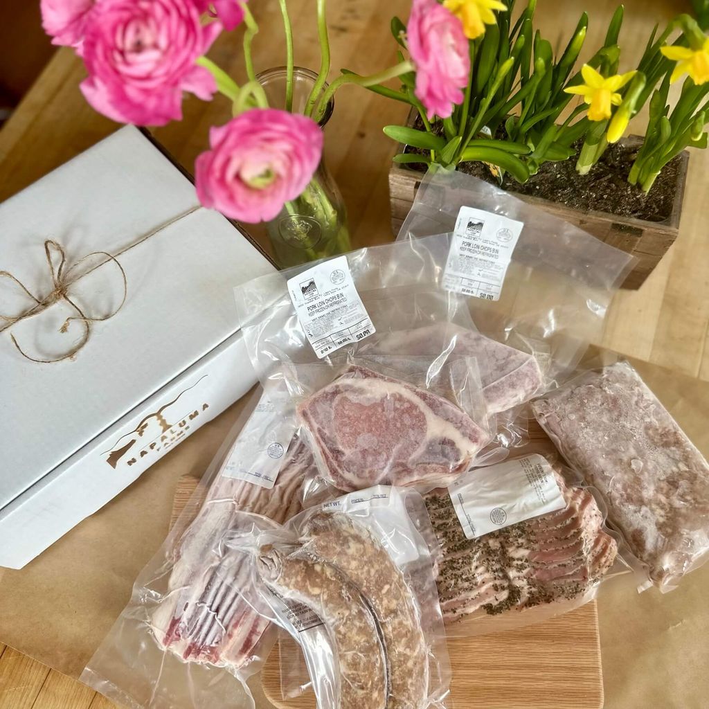 Our pork is pasture-raised in Petaluma, CA. No antibiotics. Corn & Soy free. Each monthly box will have a variety of premium cuts such as thin and thick-cut loin chops, bellies, bacon, fresh ground, stew meat, sausage, hocks, Osso Bucco, and more!