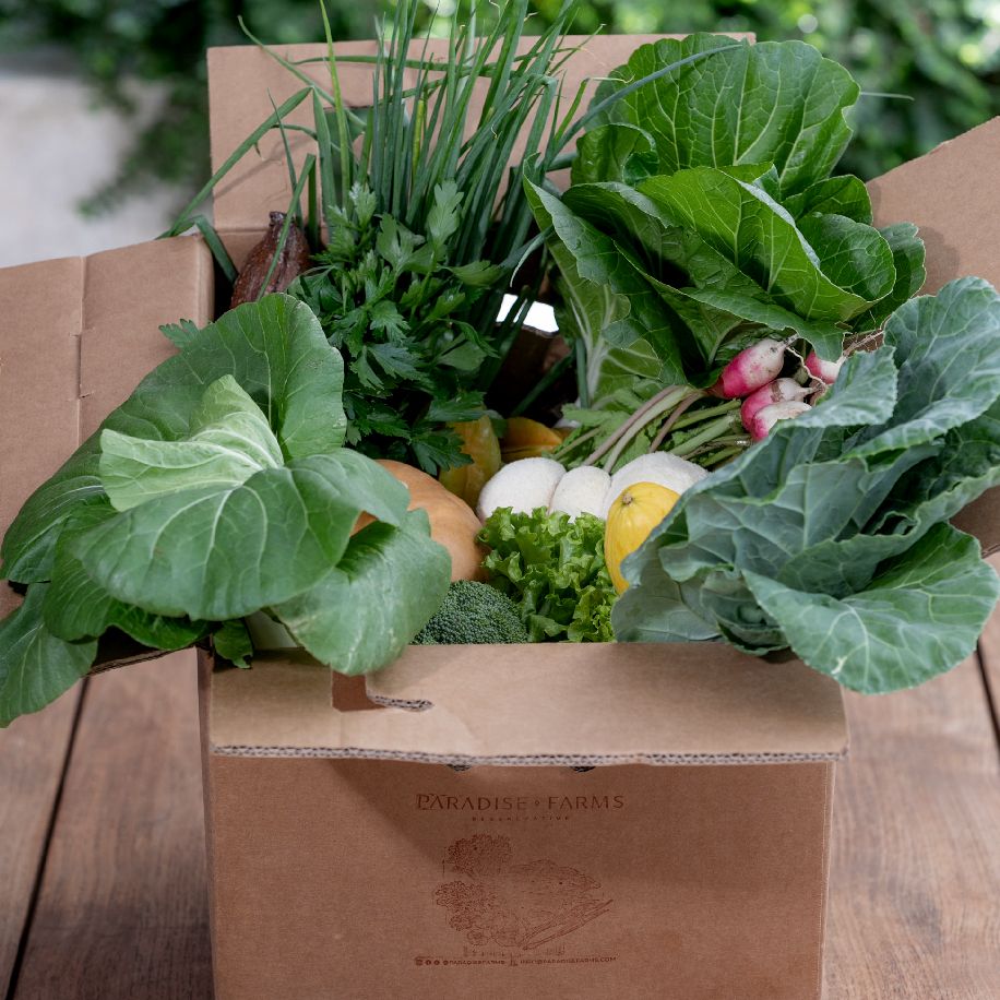 You can expect to receive: Microgreens, salad greens, 4-5 fruits and veggie varieties based on seasonal availability, mushrooms (biweekly), and 1 staple Paradise Culinary item (for example, a loaf of bread, cheese, or a dozen eggs).