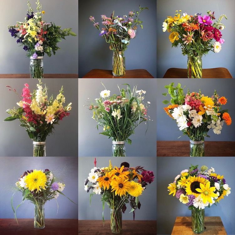 Bouquets will begin with spring blooms of Ranunculus, Anemone, Baby's Breath, Bachelor Buttons, Love in a Mist, Bells of Ireland and many more. As we advance through the season with blooms will change. June blooms include Snapdragons, Larkspur, Calendulas, Orlaya, Campanula, Strawflower, Sunflowers, Poppies and Sweet Peas. July onwards will add Zinnias, Rudebeckia, and Dahlias! In autumn we'll get some Mums and flowering Cabbages.
