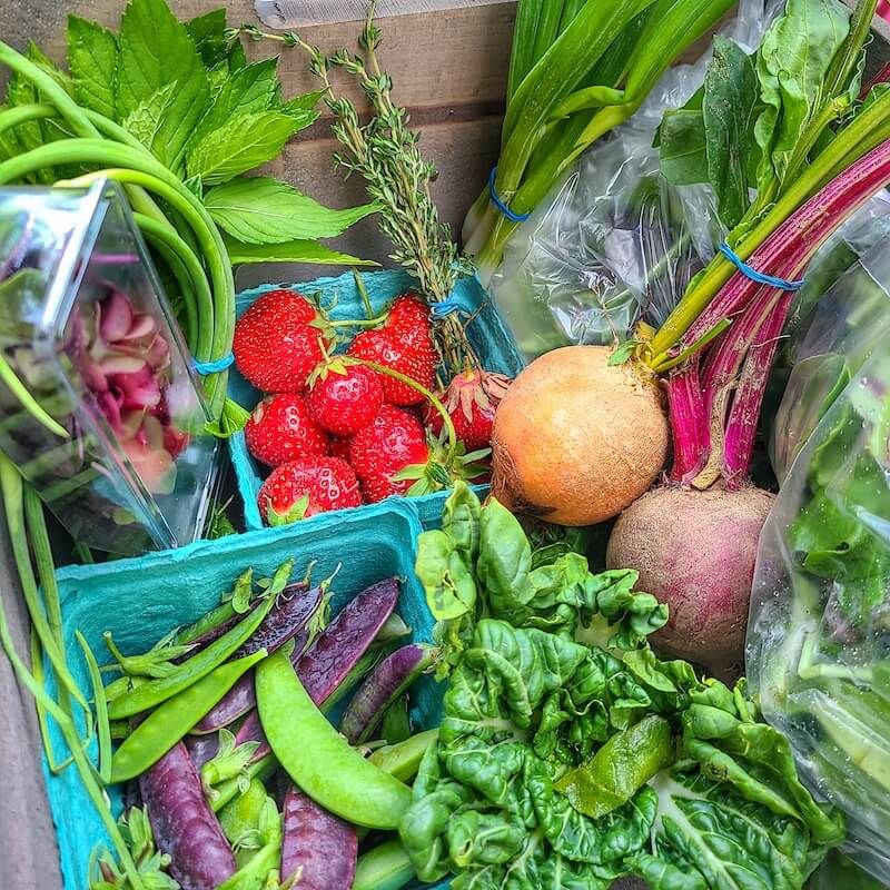 The Full Share contains approximately 7-10 items + 2 salad mix + herbs. It typically feeds 3-4 people, or 2 people who cook regularly and eat a lot of vegetables.