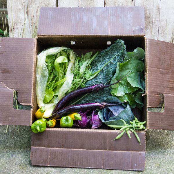 Contents: Seasonal vegetables (e.g., squash, greens, potatoes, onions, garlic), herbs (e.g., rosemary, oregano, yarrow), occasional fruits (e.g., blackberries).